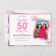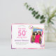 Este divertido y groovy diseño retro incluye un texto en la parte delantera que dice, "Estás invitado a una fiesta de cumpleaños número 50 para" en rosa, morado y gris en la tipografía popular, junto con un texto de personalizable y una foto que puedes reemplazar con la tuya, dentro de un marco de tintes pastel fresco con carteles de paz a juego con tiras de los años 60 en las esquinas. La parte delantera de la postal también está enmarcada por un borde de tintes pastel a juego con el arcoiris. La parte posterior de la tarjeta incluye una dirección de retorno de personalizable y detalles de fiesta sobre un sutil diseño de tinte de tintes pastel de arcoiris. Puede personalizar este elemento para su propio evento cambiando el texto y la foto en la plantilla de producto.