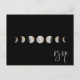 Tarjeta de respuesta de boda con petición de canción con fases de luna en acuarela dorada. La tarjeta cuenta con ilustración de fases lunares sobre fondo negro, gráfico de escritura "rsvp" en blanco, marco de dirección de flores silvestres en la parte posterior y varias líneas para su información personalizada de rsvp.