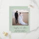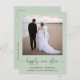 Elegancia de verde salva o pequeña invitación boda y postal de invitación a la recepción que muestra tu foto, "felizmente siempre después" escrita en un guión elegante con toques y tus nombres, fecha boda y ubicación. En la parte trasera, personaliza tu invitación boda, agrega una recepción o una invitación a fiesta y firma tus nombres casados en un guión parecido a una firma.