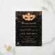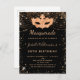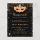 Para una elegante Mascarada, 50 años (o cualquier edad) de cumpleaños. Un elegante fondo negro. Decorado con un polvo falso purpurina dorado y una máscara de mascarada. Personalice y agregue un nombre, edad y detalles del fiesta. El nombre se escribe con un guión de estilo con letras a mano. Atrás: diseño postal.