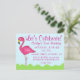 Las invitaciones presentan una ilustración original a mano de un flamenco rosa tropical, con texto y acentos rosados y verdes. Personalice simplemente con su información para un diseño de invitación de fiesta de cumpleaños único.