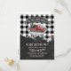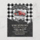 Invite a sus Navidades virtuales fiestas invitados con estilo con esta rústica invitación de tarjeta plana temática. El diseño presenta una camioneta roja de época en una escena retro y negra con nevadas y músculos. Arriba hay una pancarta gris con el nombre de su familia y debajo de los detalles de su fiesta para que usted lo personalize. El fondo de la decoración está formado por una plancha de búfalo blanca y negra y pinos. Diseñado por los artistas ©Tim y Susan Coffey.