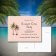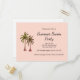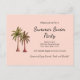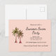 Postal de invitación de la fiesta de verano rosa Rubor, con diseño de ilustracion de palmeras y letras de tipografía de personalizable negro. Ideal para planificar tu fiesta de natación con un tema de picnic en la playa.
