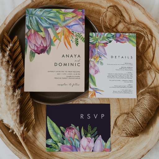 Esta floral tropical colorida | verde salve la postal de la invitación a la fecha es perfecta para su moderno destino boho, verde, púrpura, boda de melocotón. El diseño cuenta con un elegante ramo de vegetación acuática clásica y flores que pueden incluir eucalipto verde salado, protea malva y roja, hibiscos rosa rubor, ave paradisíaca naranja y azul, y hojas de palmera verde oscuro. El diseño es ideal para un boda de viajes sencillo, creativo y único para primavera, verano, otoño o invierno. Encontrará otro papel de boda que coincida o coordine el resto de la colección.