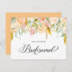Pídele a tus amigos y familia que sean parte de tu boda con esta tarjeta floral "Will You Be My Bridesmaid" con flores de melocotón de color agua con acentos de hojas de Relieve metalizado dorado y guión elegante de caligrafía. Los elementos coincidentes están disponibles.