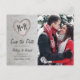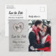 Tarjeta postal de guardar la fecha de la boda del árbol rústico con una foto de la novia y el novio, un abedul plateado del bosque con un corazón tallado con sus iniciales y la fecha de su futura boda.