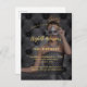 Personaliza y agrega tu foto. Plantillas para la información de su fiesta. Atrás: patrón follaje negro como fondo. He usado un overlay oscuro sobre la foto para que sea más fácil leer el texto. He agregado 2 capas, pero sólo una está activa. Hay un pequeño símbolo al final de la capa/línea superpuesta en la que puede hacer clic para ocultar o mostrar