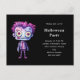 Invitación postal de la fiesta de Halloween con un lindo ilustracion. Monstruo Frankenstein con pelo rosado y púrpura y traje y corbata de dapper.