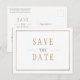 Guardar la fecha Tarjeta postal de boda minimalista en oro blanco. Simple y elegante. Blanco con texto en color oro antiguo. Diseño versátil excelente para bodas, compromisos, aniversario de boda y otras ocasiones especiales. Personalice con su propio texto y también puede eliminar o reemplazar cualquier elemento con las herramientas proporcionadas en el menú de personalización de Zazzle.