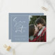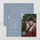 Invita a tus seres queridos a tu boda con esta tarjeta de invitación minimalista con un diseño de azul polvo. Presenta una caligrafía elegante que dice “Guardar la Fecha” junto a una foto de la pareja que se casa, la cual puedes personalizar. En el dorso, puedes incluir más detalles de la boda.