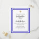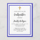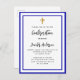 Una invitación moderna, elegante y de confirmación. Un fondo blanco decorado con marcos azul real y una cruz dorada. Personalice y agregue un nombre y detalles. Letras de color negro.