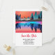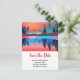 Tarjeta postal de guardar la fecha con un hermoso diseño gráfico que presenta un lago tranquilo con ciervos. y altos pinos reflejados en el agua. Las estrellas flotan en lo alto.