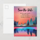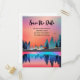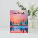 Tarjeta postal de guardar la fecha con un hermoso diseño gráfico que presenta un lago tranquilo con ciervos. y altos pinos reflejados en el agua. Las estrellas flotan en lo alto.