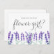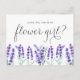 ¿Serás mi chica de flores? Pídele a sus amigos y familiares que sean parte de su boda con esta tarjeta de presentación de la fiesta nupcial. Cuenta con flores de lavanda de color acuático. Personalice agregando nombres y mensajes. Esta tarjeta de chica floral morada es perfecta para bodas de primavera e invierno.