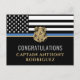Este diseño presenta una bandera de la fuerza policial con franjas negras y blancas, y también una franja de delgada línea azul. La insignia de la policía y el texto dorado se encuentran encima de todos los detalles de la fiesta para la jubilación del oficial de la ley, alguacil, capitán o jefe de policía.
