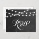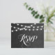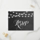 Moda boda verano moderno RSVP respuesta diseño de postal con elegantes y sencillas luces de cuerda brillantes colgando por encima y una elegante mezcla de fuentes de escritura modernas y caligráficas sobre un fondo de textura falso color de agua impreso. Un diseño sencillo y elegante, perfecto para el verano. Haga clic en el botón IT PERSONALIZAR para personalizar de fuentes, mueva el texto y cree su propio diseño único de invitación.