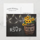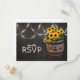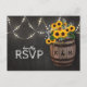 Tarjetas de respuesta de boda campestre con estilo que presentan un fondo rústico de pizarra negra, luces centelleantes de cadena, girasoles amarillos dorados de verano, un barril de madera de viñedo con sus iniciales y un trozo de cuerda anudada.