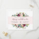 Invitación a una boda floral de moda con flores de color azul y burdeos con un follaje botánico exuberante en la parte superior e inferior con oro contra una franja rosa pastel. Perfecto para bodas con temática primaveral o veraniega.