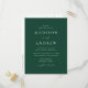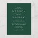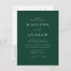 Postal minimalista y moderna de invitación a la boda con los detalles de su boda en letras blancas con acentos caligráficos. El fondo verde del bosque puede cambiarse a un color de su elección. Personalice la parte posterior de la tarjeta postal de invitación a la boda de la moda con su dirección de retorno, la fecha de respuesta deseada, el sitio web del boda y las instrucciones para los invitados que utilicen las plantillas de texto proporcionadas. Diseñado para coordinar con nuestra colección de bodas Modern Elegance.