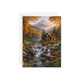 This enchanting scene captures the magic of fall: fiery foliage, gentle waterfalls tumbling over mossy stones, vibrant wildflowers blooming along the banks, and butterflies dancing in the warm light. A lone deer stands quietly by the lake, while smoke curls from the chimney — hinting at warmth, comfort, and quiet solitude.