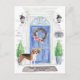 Anuncie su nueva dirección con nuestra elegante invitación con una Beagle, una puerta delantera azul, estera de bienvenida, letrero de pizarra, topiarios y una corona floral sobre un fondo de ladrillo gris.