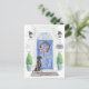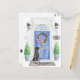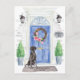 Anuncie su nueva dirección con nuestra elegante invitación con un Black Lab, puerta delantera azul, estera de bienvenida, letrero de pizarra, topiarios y una corona floral sobre un fondo de ladrillo gris.