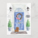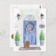 Anuncie su nueva dirección con nuestra elegante invitación con un caniche, una puerta delantera azul, estera de bienvenida, letrero de pizarra, topiarios y una corona floral sobre un fondo de ladrillo gris.