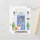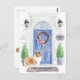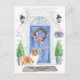 Anuncie su nueva dirección con nuestra elegante invitación con un Rough Collie, puerta delantera azul, estera de bienvenida, letrero de pizarra, topiarios y una corona floral sobre un fondo de ladrillo gris.