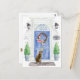 Anuncie su nueva dirección con nuestra elegante invitación con un gato bengalí, puerta delantera azul, alfombra de bienvenida, topiarios y una corona floral sobre un fondo de ladrillo gris.