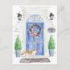 Anuncie su nueva dirección con nuestra elegante invitación con un gato escocés frito, puerta delantera azul, alfombra de bienvenida, letrero de pizarra, topiarios y una corona floral sobre un fondo de ladrillo gris.