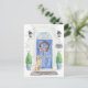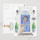 Anuncie su nueva dirección con nuestra elegante invitación que incluye un recaudador de Labrador, puerta delantera azul, alfombra de bienvenida, letrero de pizarra, topiarios y una corona floral sobre un fondo de ladrillo gris.