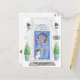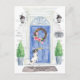 Anuncie su nueva dirección con nuestra elegante invitación con un puntero inglés, puerta delantera azul, alfombra de bienvenida, letrero de pizarra, topiarios y una corona floral sobre un fondo de ladrillo gris.