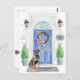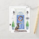 Anuncie su nueva dirección con nuestra elegante invitación con un rottweiler, puerta delantera azul, alfombra de bienvenida, topiarios y una corona floral sobre un fondo de ladrillo gris.