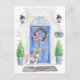 Anuncie su nueva dirección con nuestra elegante invitación con Schnauzer, puerta delantera azul, estera de bienvenida, pizarra, topiarios y una corona floral sobre un fondo de ladrillo gris.