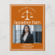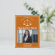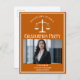 Esta invitación a la fiesta de postales para graduación de la escuela de derecho naranja incluye tipografía blanca para una clase de graduado de 2024 sobre su foto de estudiante. Personalizar con tu año de graduación bajo la escala de la justicia y fotografía de un gran abogado o abogado personalizado invitan a postales.