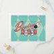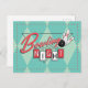 La postal de Noche de Bolos presenta la tipografía "Noche de Bolos" en un logotipo retro de estilo moderno de los 50, con bola de bolos y bolos ilustrados. Incorpora elementos de azul, rojo, blanco y gris, puntos y un fondo con patrón de diamantes.