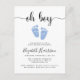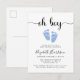 Un niño pequeño y pequeño espolvorea la invitación de la postal con "oh boy" en un guión elegante con toques y una acuarela azul pastel de pies de bebé. Personalice fácilmente los detalles de la rociada de bebé.
