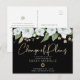 Asegúrate de que todos tus amigos y familiares puedan seguir celebrando el aniversario Bat Mitzvah de tu hija, independientemente de las circunstancias globales imprevistas actuales. Envía esta elegante tarjeta postal de "Cambio de planes" personalizada. Un floral acuarela blanco y dorado con tipografía de falso foil dorado y tipo sans serif blanco se superpone a un dramático fondo negro. Personaliza el texto personalizado con el nombre y la fecha de tu Bat Mitzvah. Tu mensaje personalizado, una Estrella de David dorada y tu dirección de devolución adornan la parte posterior. ¡Asegúrate de que su celebración especial siga siendo tan festiva como estaba planeada originalmente!