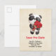Tarjeta postal Save the date con un adorable dibujo a la acuarela. Un adorable oso panda blanco y negro que lleva un ramo de rosas.