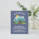 Una bonita escena de camping con pinos, una carpa, una barbacoa, una canasta de picnic, una guitarra, una chimenea de leña, un voleibol, una tumbona y una sombrilla de playa, una maleta, una radio y una cometa. ¡Mira si puedes encontrar todos los elementos! El fondo es azul marino. "CAMINO SOBRE" está curvado sobre la parte superior en grandes y audaces capitales y los detalles de su personalizado fiesta aparecen debajo. Estas postales se revierten a un color azul cielo.