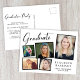 Postal de invitación de fiesta de graduación moderna con un collage de cinco fotos de imágenes dispersas en marcos, "Graduado" en un guión elegante, el nombre del graduado en tipografía elegante y su año escolar y de clase en tipografía simple. Añada los detalles de su fiesta al dorso.