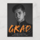 Invite a los huéspedes a celebrar a los invitados con nuestra fiesta de graduación de fotos de Modern Paint Splatter. El diseño presenta la foto vertical del graduado con "Grad" en letras naranjas con salpicaduras de pintura blanca. Personalice la parte delantera de las invitaciones creativas a la fiesta de graduación agregando el nombre del graduado, el nombre de la escuela y el año de graduación. La postal posterior de la fiesta de graduación incluye la dirección de retorno y los detalles del fiesta. El diseño es perfecto tanto para graduados de secundaria como universitarios.