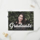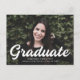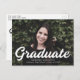Postales simples y elegantes para la invitación a la fiesta de graduación con la foto horizontal del graduado con "Graduado" en un audaz guion blanco. Personalice la invitación de la fiesta de graduación con fotos agregando el nombre del graduado, el nombre de la escuela y el año de graduación. La invitación se invierte para mostrar la dirección de retorno y los detalles de la fiesta de graduación.