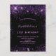 Una invitación de cumpleaños número 21 (o cualquier edad) femenina y delicada. En la parte delantera: un fondo negro chic. Decorado con polvo de purpurina falso de color morado oscuro. Personaliza y agrega un nombre y detalles de la fiesta. El nombre está escrito con una tipografía de letra a mano, con letras de color morado claro.