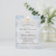 Un fondo falso de color plateado decorado con el polvo azul falso purpurina, un cáliz dorado y un anfitrión. Personalice y añada un nombre y detalles de recepción. Letras de color negro.