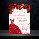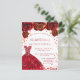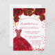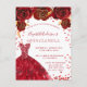 Una invitación moderna, elegante y glamurosa para una fiesta de 15 años en Quinceañera. Un fondo blanco con chispas, un vestido rojo y rosas rojas, flores. El nombre está escrito con una escritura de estilo con letras a mano moderna. Personalice y agregue los detalles de su fiesta.
