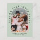 Tarjeta postal de invitación a elopamiento o recepción de boda privada moderna en verde sage. La parte frontal presenta la foto de su día de boda en un marco de arco y "Fiesta Felices para Siempre" en tipografía elegante. Agregue sus nombres y fecha de boda. En el reverso, personalice su mensaje y agregue sus nombres en una escritura similar a una firma.