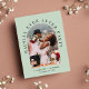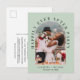 Tarjeta postal de invitación para una elopción moderna en verde sage o anuncio de boda privada y recepción. La parte delantera presenta la foto de su boda en un marco de arco y "Fiesta Felices para Siempre" en tipografía elegante. Agregue sus nombres y fecha de boda. En el reverso, personalice su mensaje y agregue sus nombres en una escritura similar a una firma.