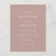 Postal minimalista y moderna de invitación a la boda con los detalles de su boda en letras blancas con acentos caligráficos. El fondo polvoriento del rosa puede cambiarse a un color de su elección. Personalice la parte posterior de la tarjeta postal de invitación a la boda de la moda con su dirección de retorno, la fecha de respuesta deseada, el sitio web del boda y las instrucciones para los invitados que utilicen las plantillas de texto proporcionadas. Diseñado para coordinar con nuestra colección de bodas Modern Elegance.