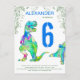 Todos los dinosaurios se están preparando para celebrar tu pequeño T. rex que cumple seis años. Este Roaring colorido T. Rex y lindo estegosauro invitan a los fans de Dino a una fiesta prehistórica de cumpleaños 6 en la selva para los amantes de los dinosaurios. Personalice esta invitación al tiranosaurio y al estegosaurio añadiendo el nombre del niño o chica de cumpleaños, el número de cumpleaños y los detalles del fiesta y todos se preparan para una divertida fiesta de cumpleaños de dinosaurios jurásicos con temática verde y azul. Todas las especies de dinosaurios son bienvenidas. Ilustraciones de Dinosaur de la era del jurásico prehistórico, obra original de la artista Catherine Sweetman